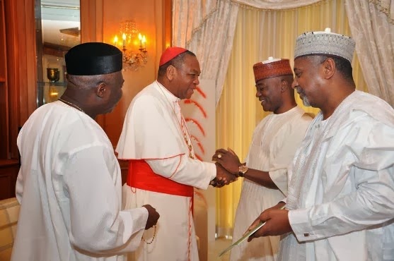 CHIEF OF STAFF, CHIEF MIKE OGHIADOMHE; BISHOP OF ABUJA ARCHDIOCESE, JOHN CARDINAL ONAIYEKAN; INSPECTOR-GENERAL OF POLICE, MOHAMMED ABUBARKA AND THE NATIONAL SECURITY ADVISER, COL. SAMBO DASUKKI (RTD) DURING A SALLAH HOMAGE TO PRESIDENT GOODLUCK JONATHAN IN ABUJA ON TUESDAY